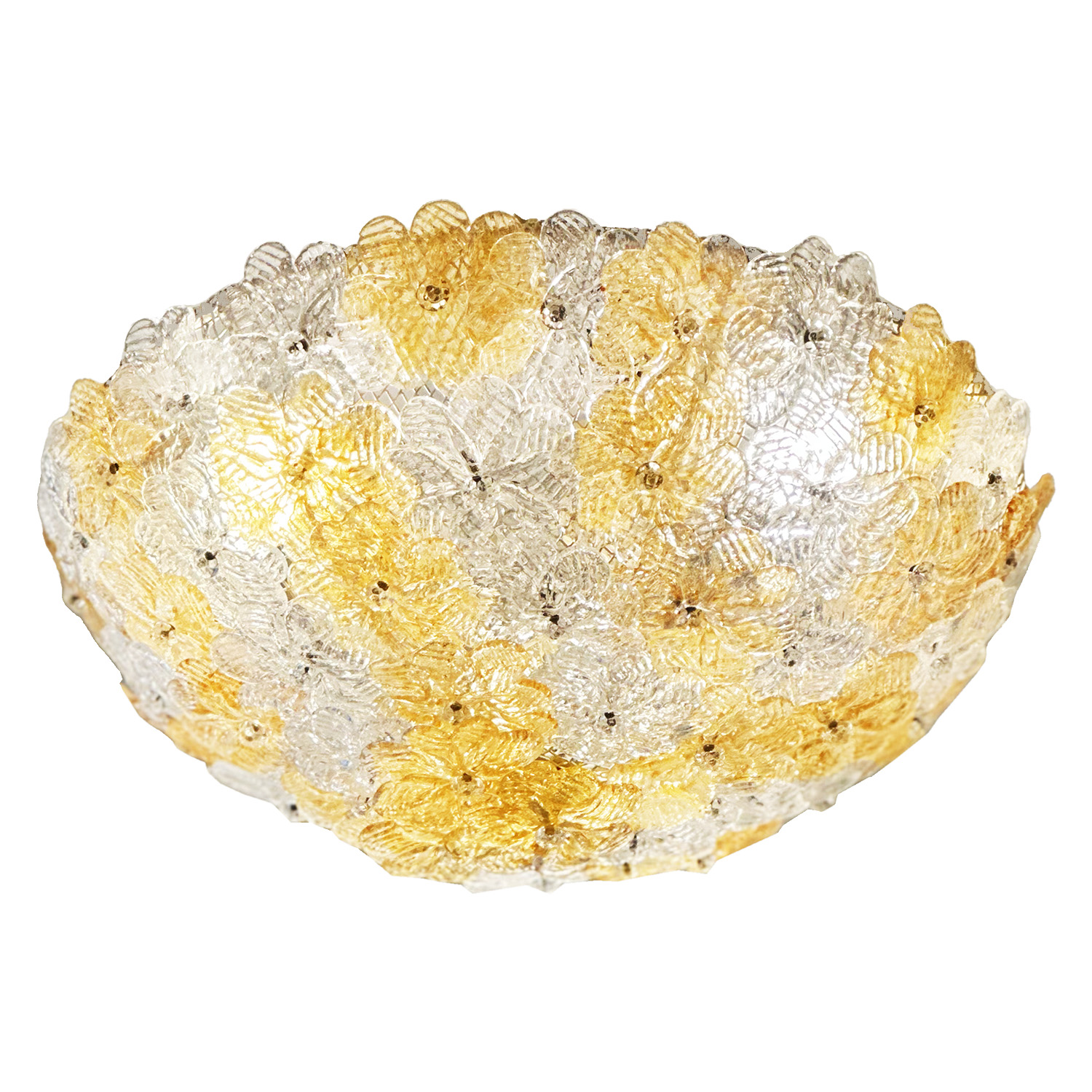 This charming ceiling fixture was made by Seguso in the 1960s. Its crucible-shaped design is adorned with a delicate bouquet of amber and clear impressed glass flowers intricately arranged in an overlapping pattern, resembling lace. Each handmade flower is fastened to the fixture’s wire mesh base by a single post capped with a small glass sphere. The shine of the crisp, clear glass and warm tones of the amber give this fixture a luxurious and elegant appearance. The evenly spaced spherical elements add to the piece’s decorative appeal, making it the perfect addition to both traditional and contemporary spaces alike.