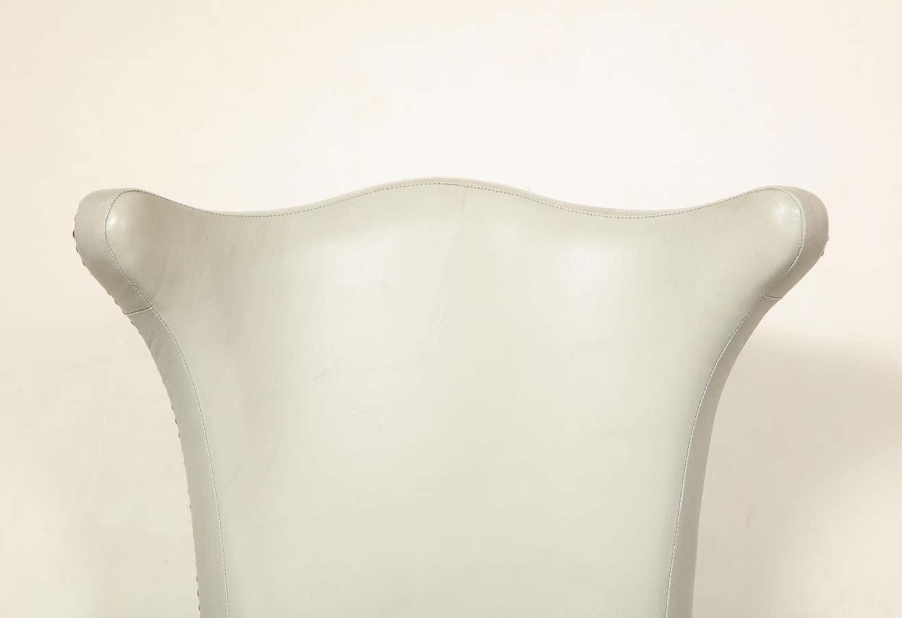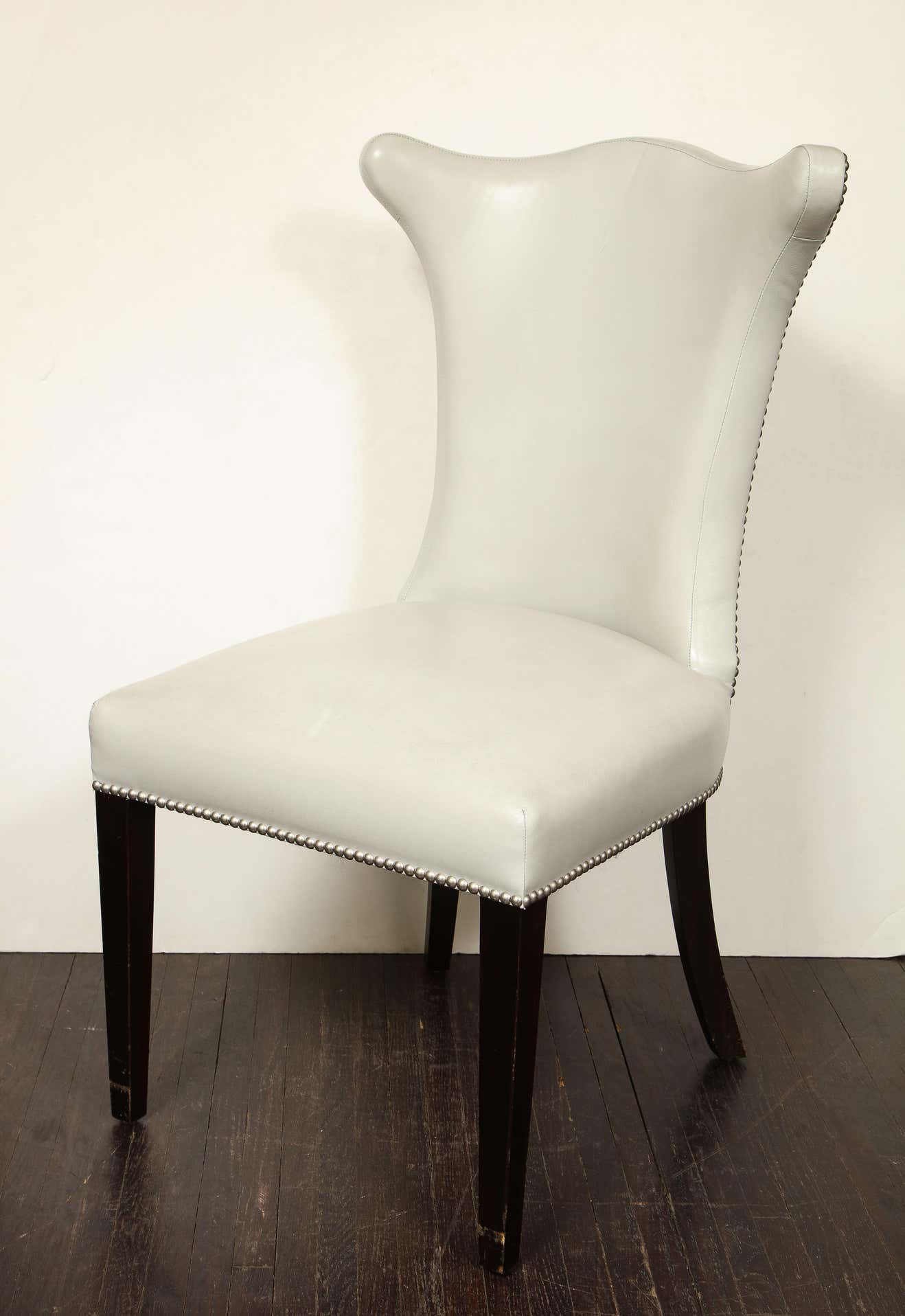 Chic set of 8 leather dining chairs with chrome nailheads. They are floor model samples. The finish on the legs shows some The leather upholstery is in.