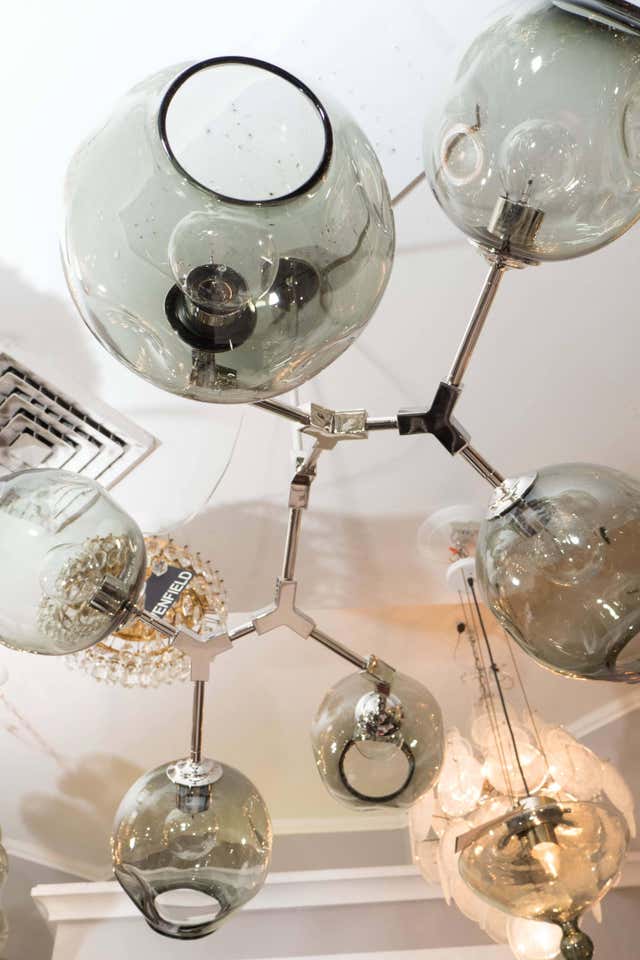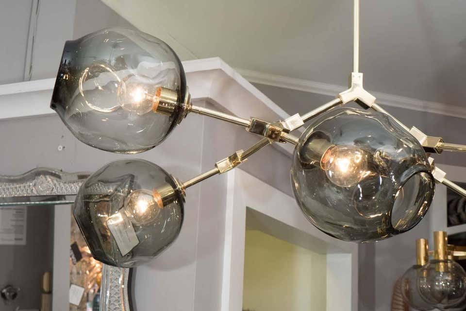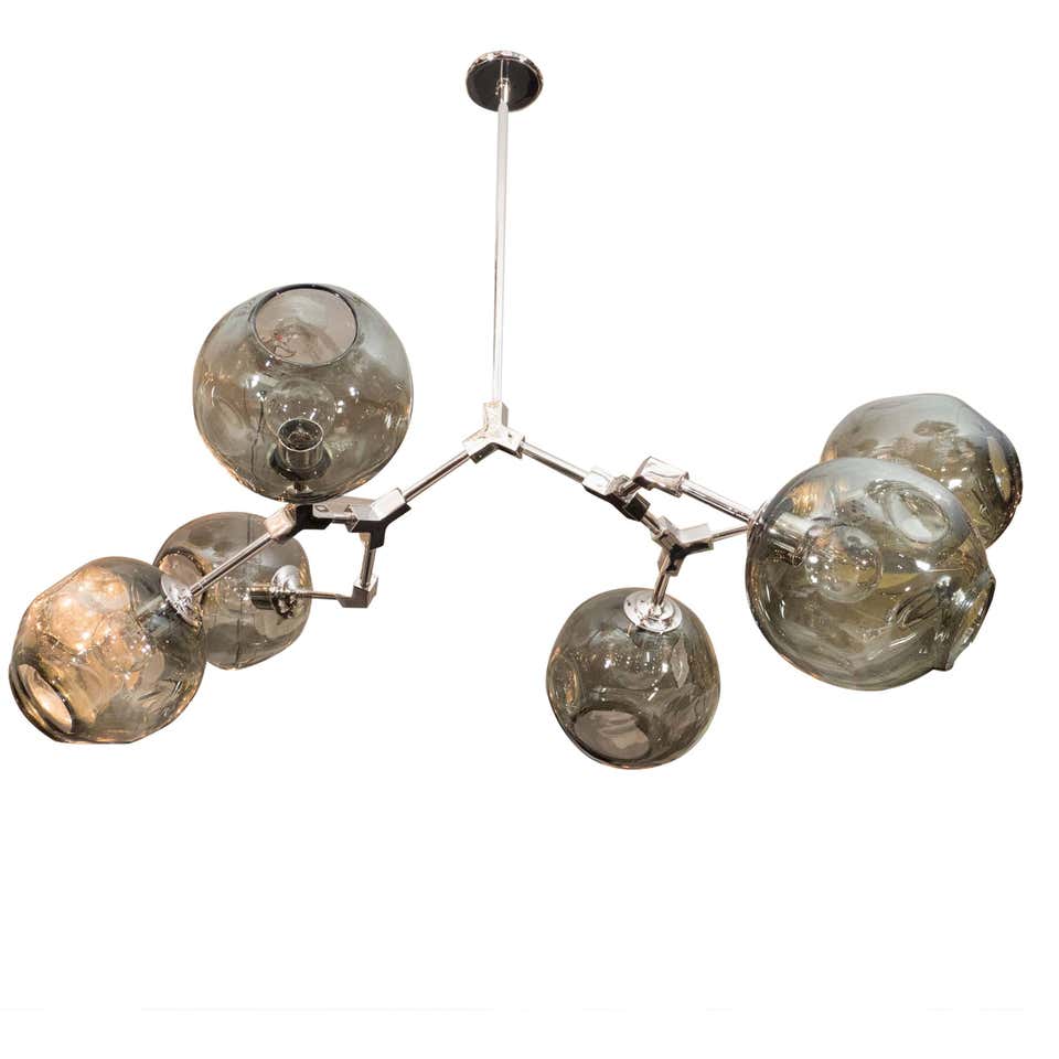 Six-globe branch chandelier with smoke glass. Shown in polished nickel.Currently on display in our NYC showroom. Customization available upon request.