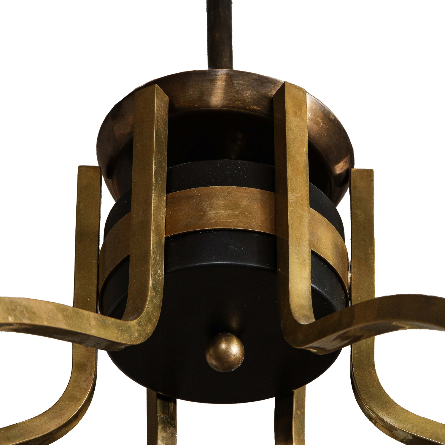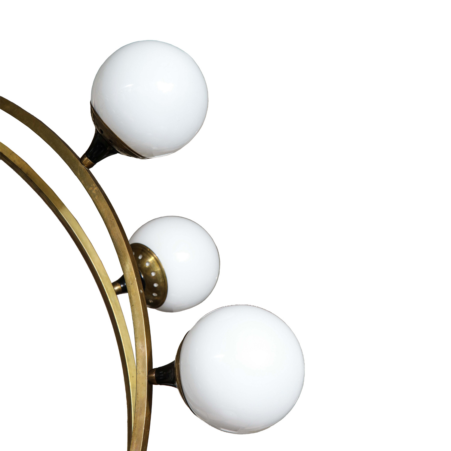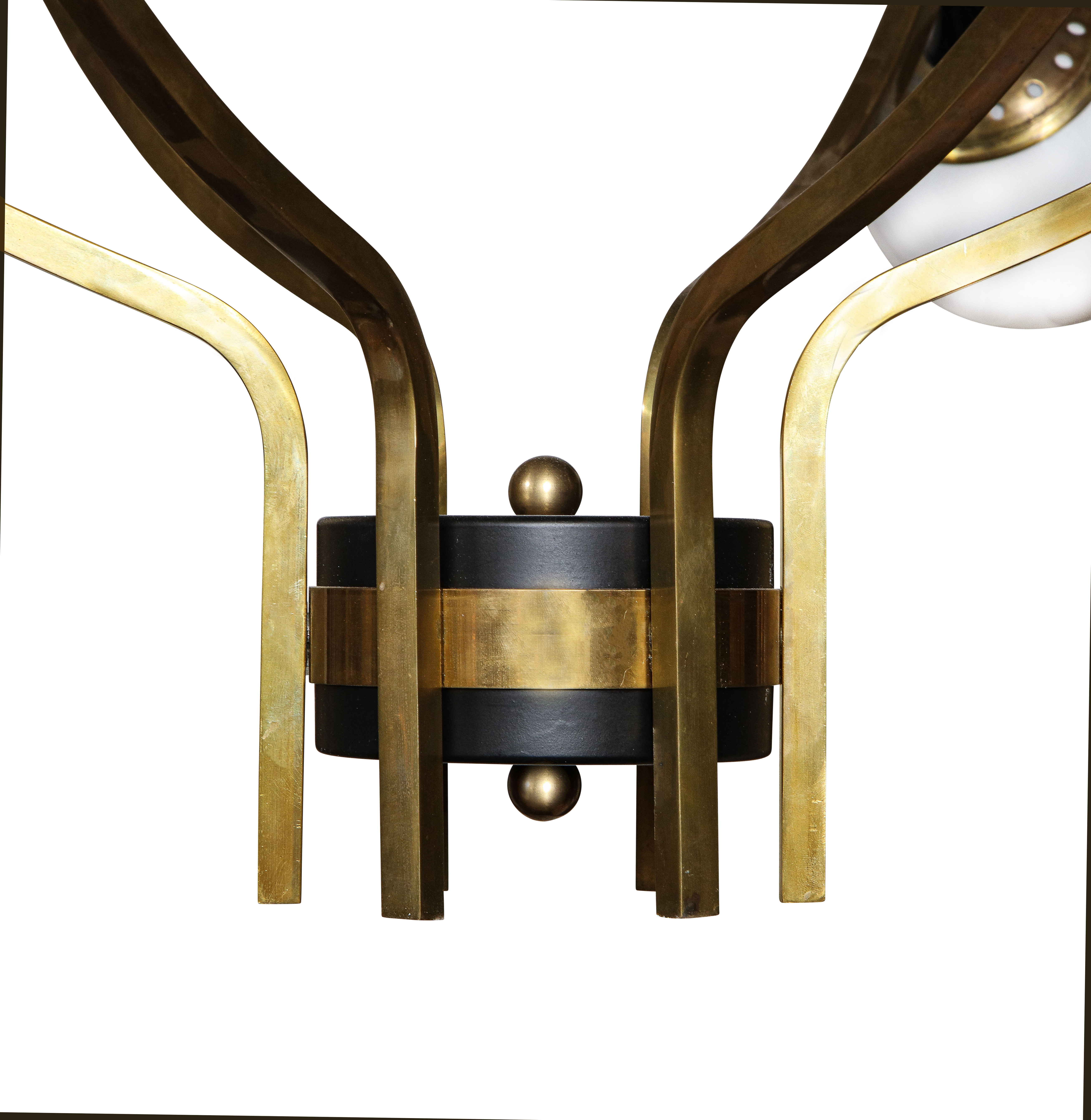 Large and impressive black lacquered steel and brass spherical chandelier with opaline glass globes by Stilnovo. Italy, 1970.