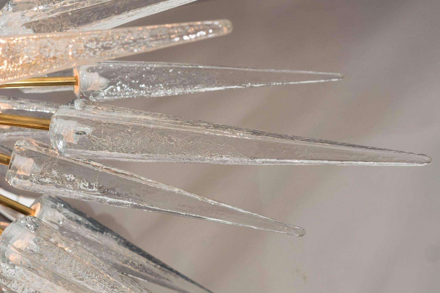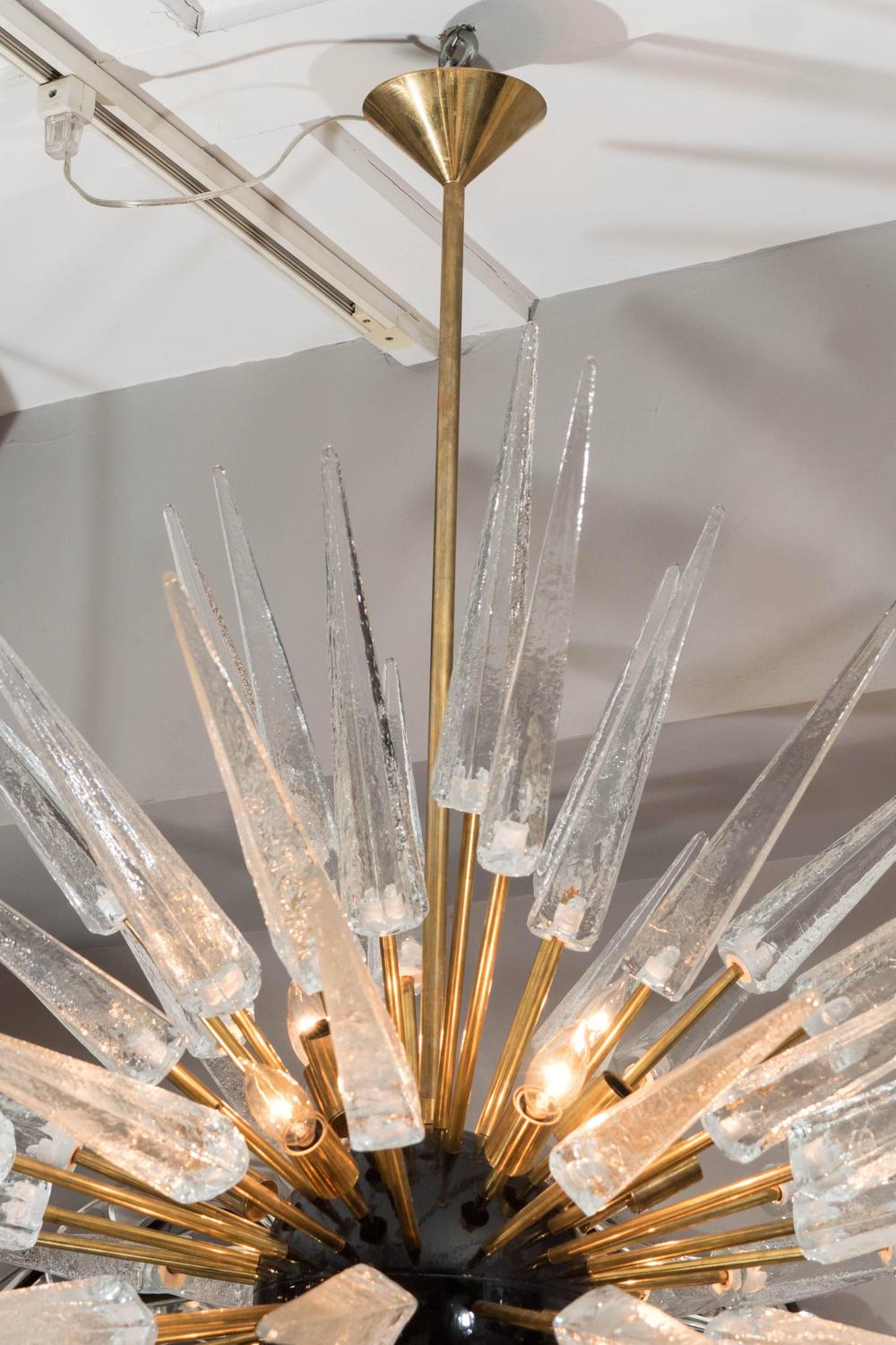 Clear Murano glass spike Sputnik chandelier with black center sphere and un-lacquered brass finish frame. Customization is available in different sizes, finishes and glass colors.