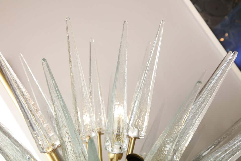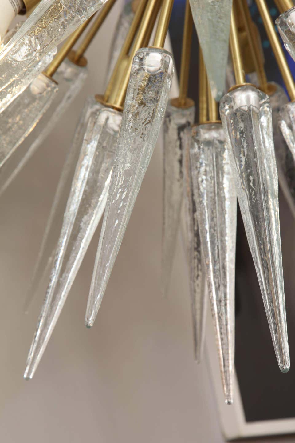Stunning Murano glass spike sputnik chandelier in clear glass and satin brass arms with ebony black sphere.