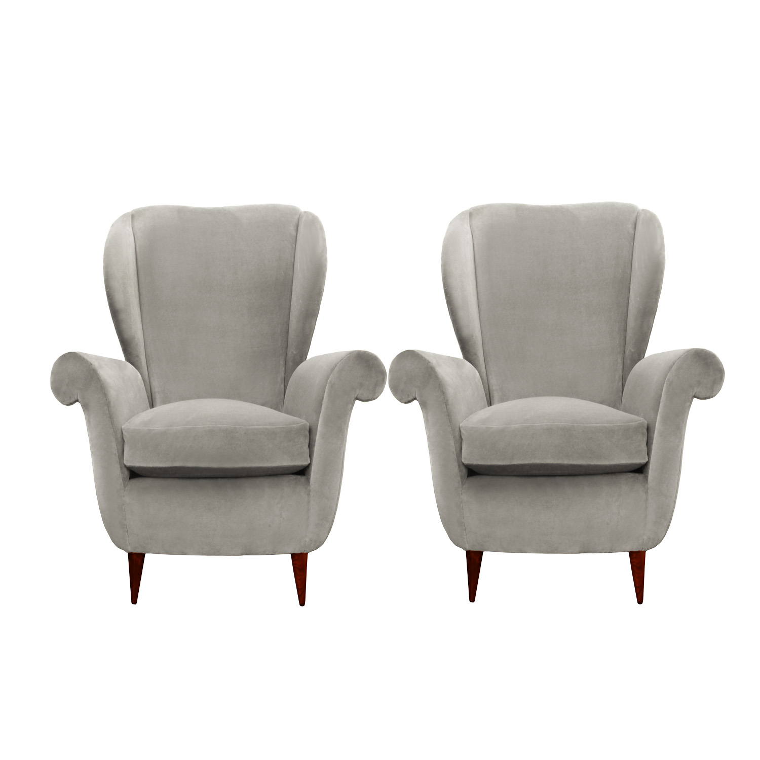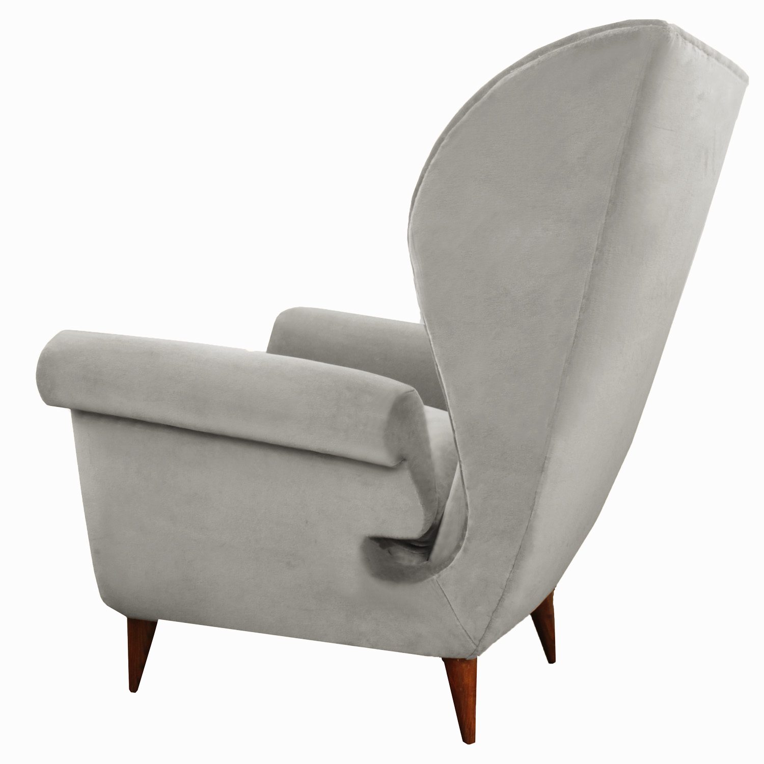Generously proportioned pair of high back wing chairs, newly upholstered in luxurious gray velvet with mahogany legs. Italy 1950's.