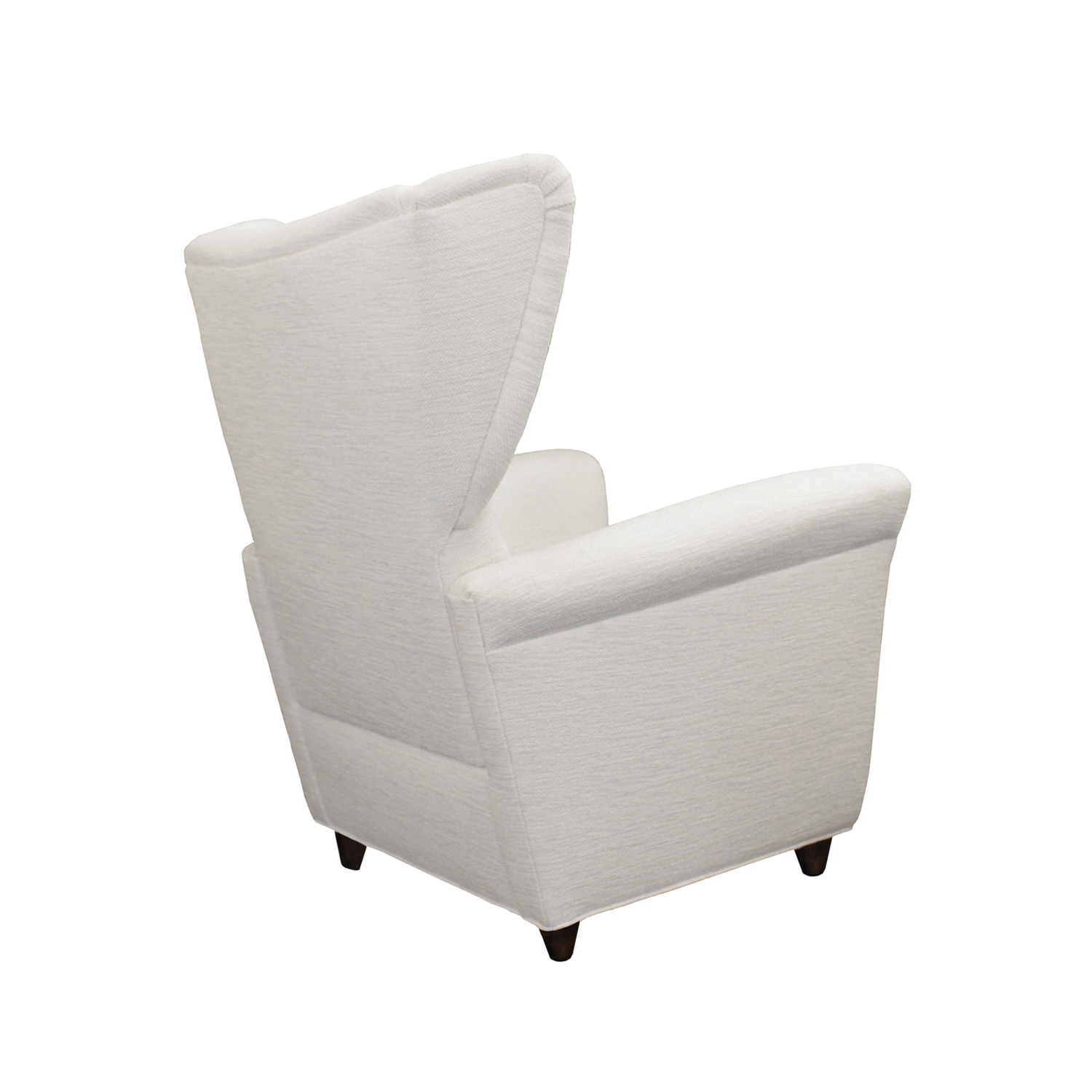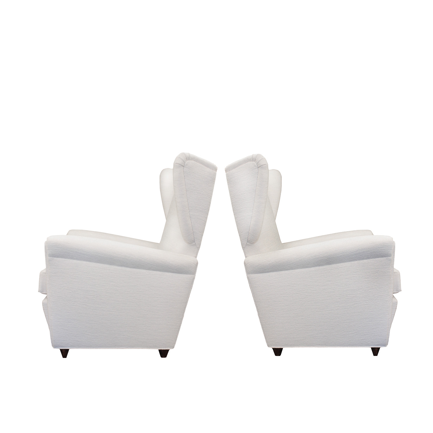 Pair of stylish reclining wingback lounge chairs with dark wood bullet feet. Newly reupholstered in textural white fabric by Venfield. Italian 1960's.