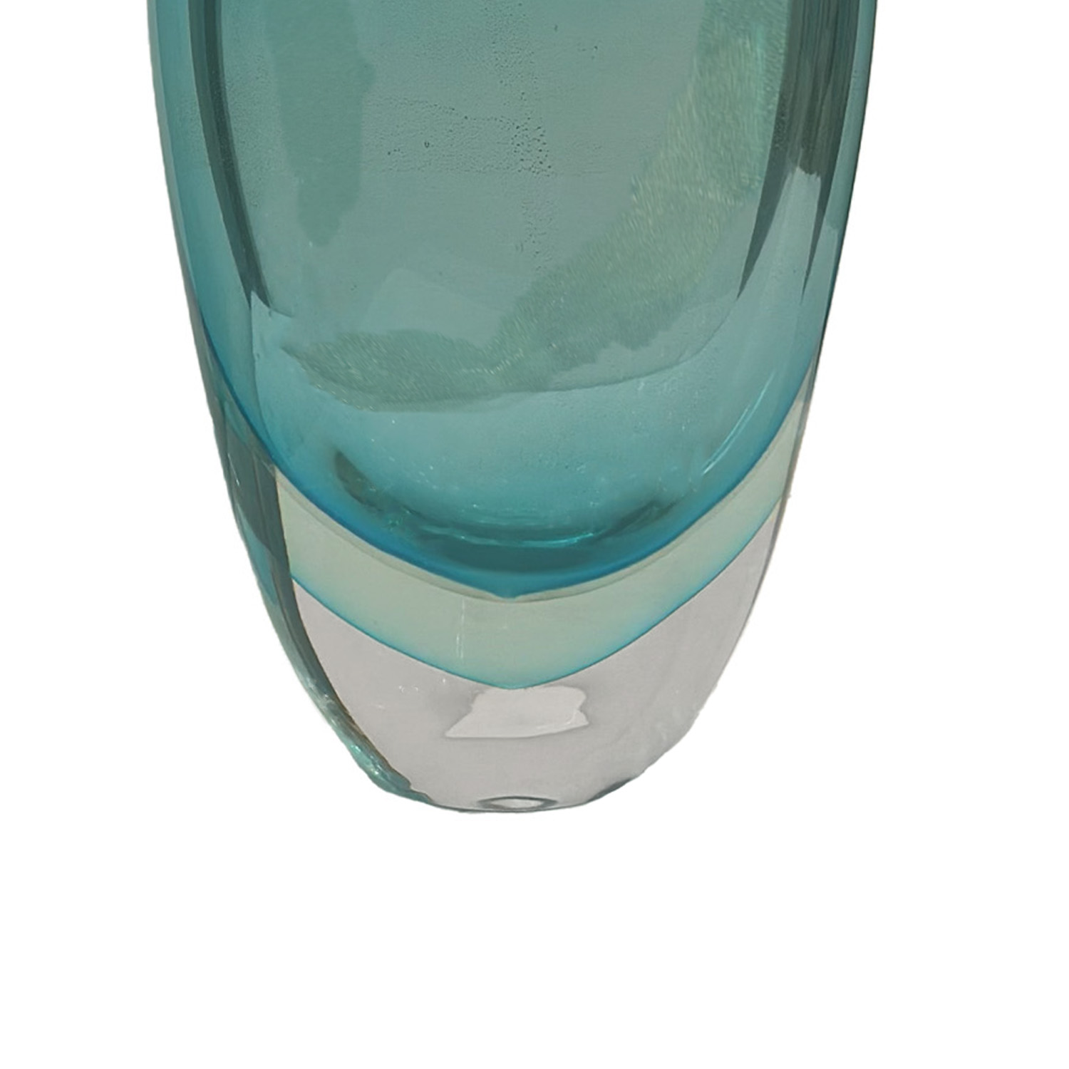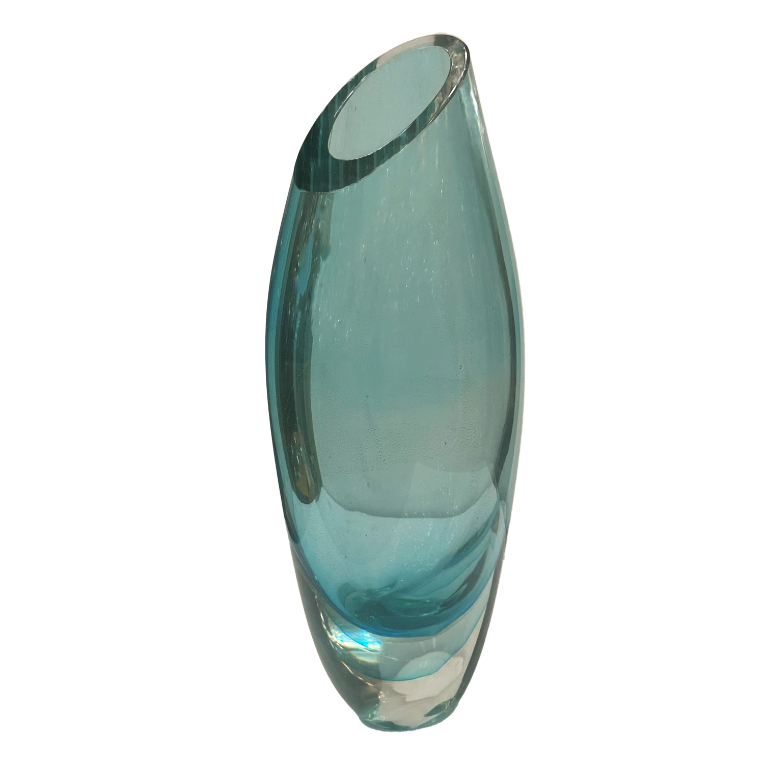 Hand- blown Murano glass vase meticulously crafted in rich shifting shades of turquoise with bands of gold avventurina that shimmer and vanish with the changes in light. The elegant almond shaped vessel of thick sommerso glass is tapered at the base and widens with A testament to the craftsmanshiop Muranese glass makers, this vase will enhance the beauty of any space in which it's displayed. This vase is available in two sizes that compliment eachother wonderfully. They are currently displayed in our New York City showroom.