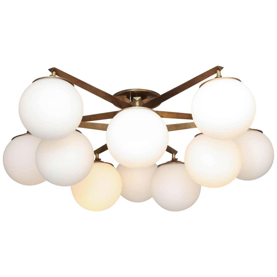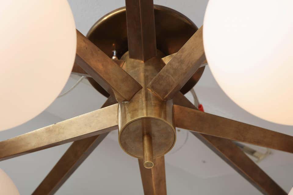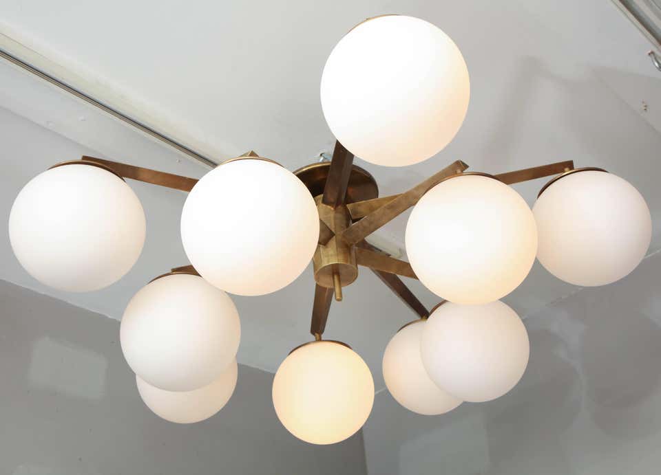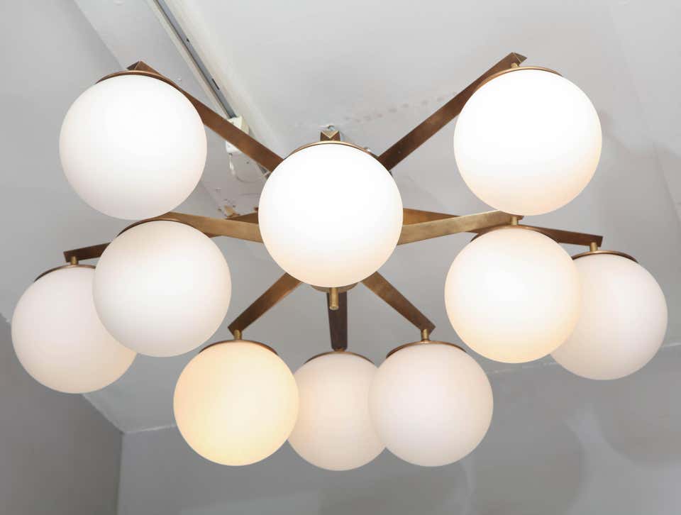 Ten opaline glass globe chandelier with antique brass finish frame. Made in Italy in late 2010's. A floor model in Made to order is also available for different sizes and finishes.