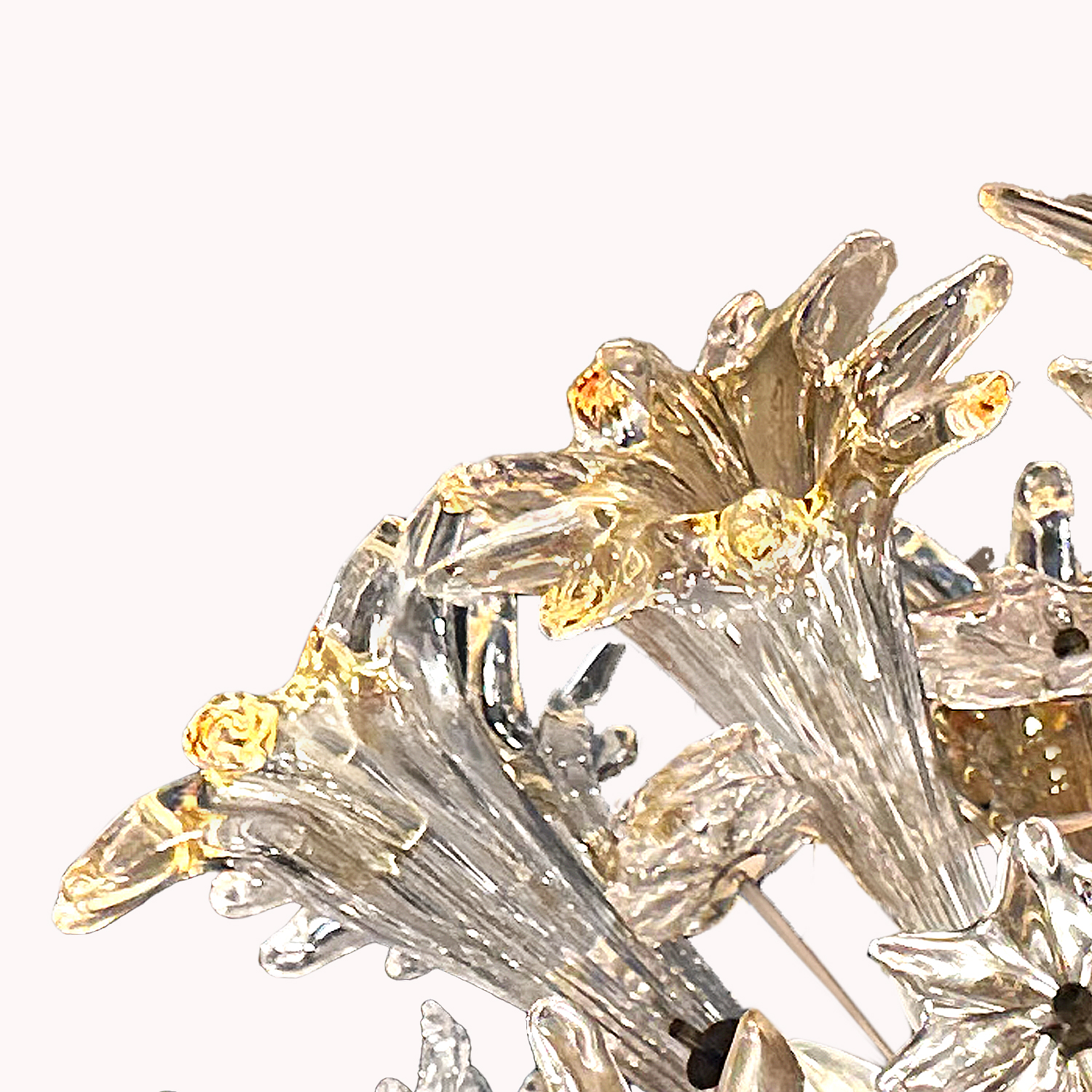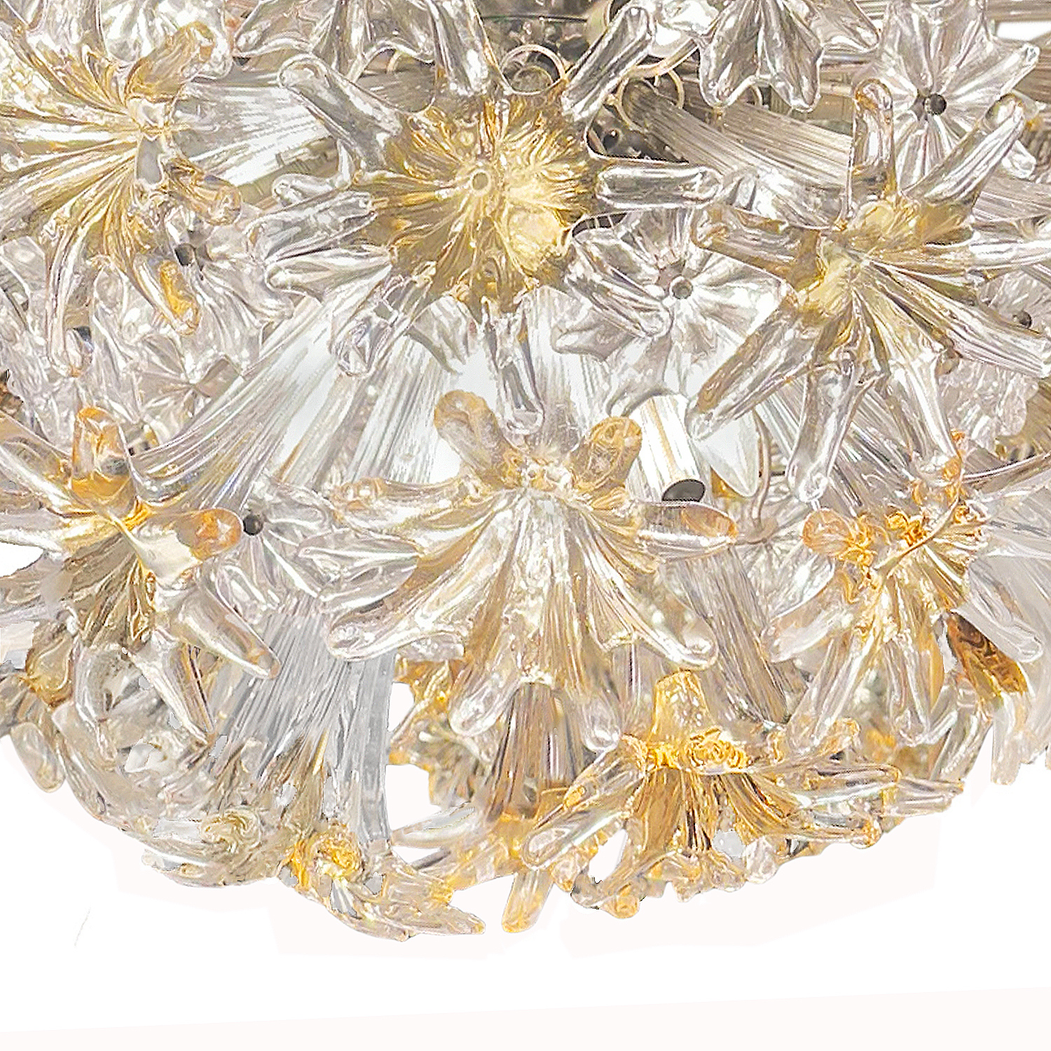 Elagantly hand-crafted clear and amber color Murano glass and chrome "Espirit" chandelier. This iconic, Sputnik-style fixture of glass flowers by renowned designer Toni Zuccheri draws inspiration from the natural world, creating organic forms that are both elegant and sophisticated. The Esprit is Zuccheri's third successful glass design for Venini proceeded by the Tronchi and Corteccia. Italy, 1970s