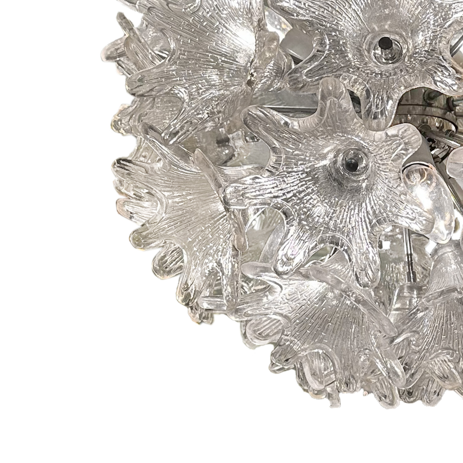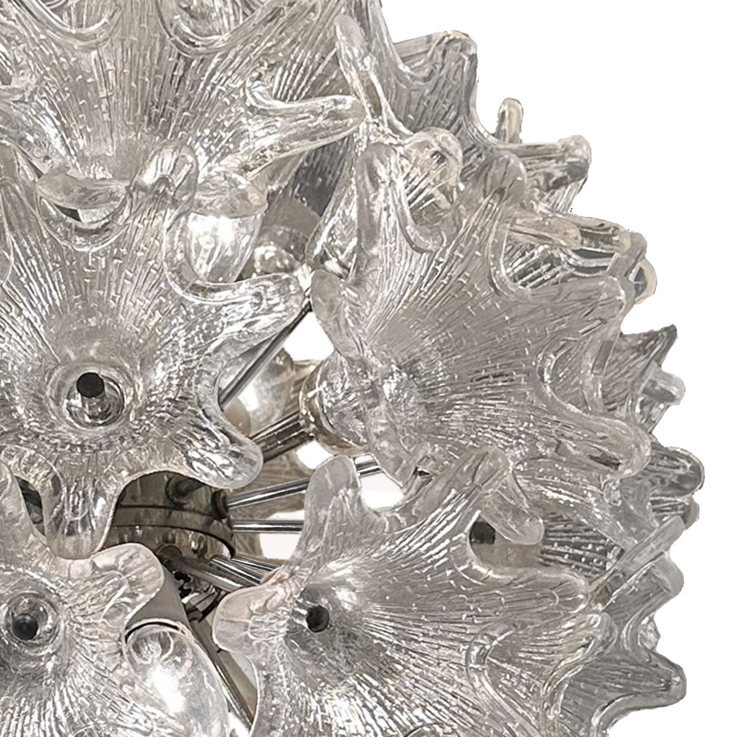 The hand crafted clear Murano glass & chrome petite "Esprit" chandelier. This iconic sputnik style pendant fixture embodies the same organic qualities and elegance as its larger counterpart in a fraction of the size. Designed by Toni Zuccheri for Venini. Italy 1970's.