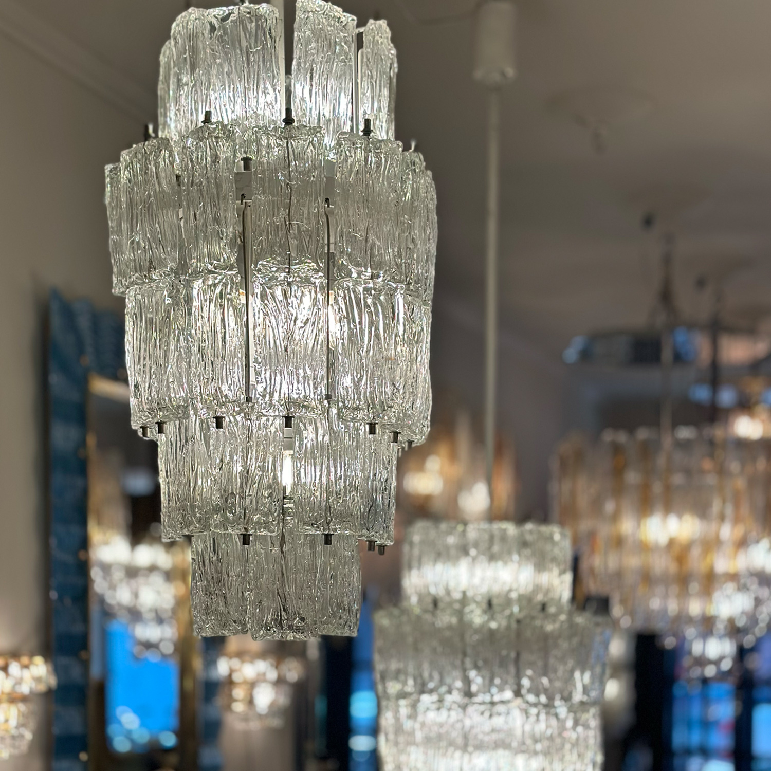 One of the three glass designs Toni Zuccheri created for Venini, corteccia or bark glass was impressed with a pattern resembling the gnarled surface of tree bark. Not only was the abstract pattern visualy interesting, but it also served to hide the lightbulbs and to a greater extent, it diffused the direct light the bulbs emitted. Corteccia was usually found on tubular- or ribbon-shaped glass, so the pieces would resemble branches or strips of bark. What's special about the corteccia glass in this chandelier is that the glass pieces are tile-shaped and thicker than the tube or ribbon glass usually used. The thicker glass results in a more deeply impressed pattern with greater diffusing ability. Venfield currently has three of these five-tiered corteccia glass chandeliers with white powder-coated steel frames. Each has 10 sockets and fits E26 torpedo-shaped bulbs. They are currently on display in our NYC showroom. Priced and sold individually. Stems can be cut to match. OA & OA Frame shows.