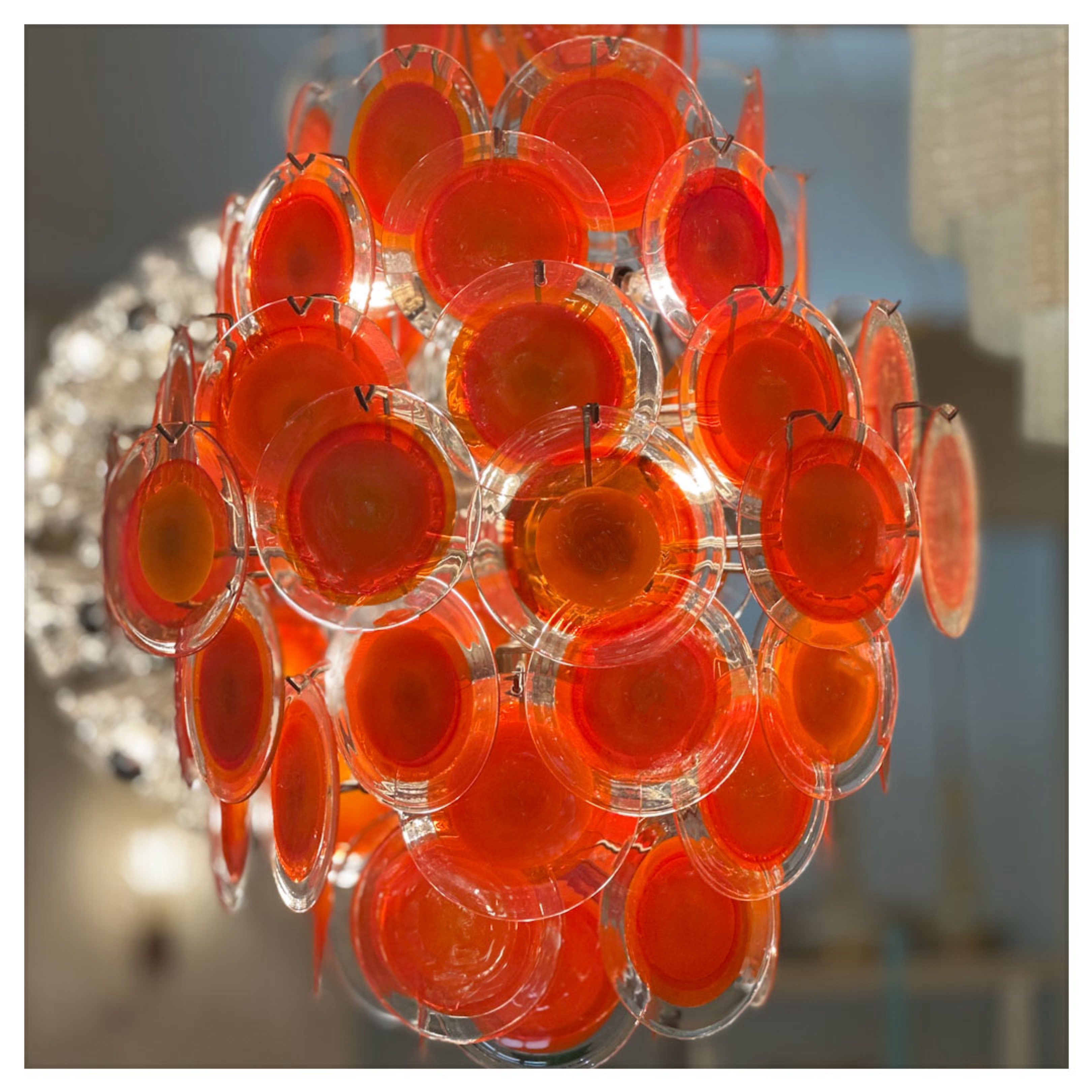 Vetreria Vistosi, founded in 1945, is renowned for its glassmaking technique of blending traditional methods with contemporary aesthetics. Vistosi creations are best characterized by their unique design, craftsmanship and use of vibrant colors. The company, which has placed a strong emphasis on innovation from the beginning, often experiments with new materials, methods and technologies. Vistosi's long history of collaborations with acclaimed designers has resulted in collections that, like Angelo Mangiarotti's "Giogali" glass links, have become iconic. This 1970s double-cone Murano disc chandelier exemplifies the Vistosi blend of traditional glassmaking with an aesthetic that suited more contemporary tastes of the times. The quintessential glass disc, a staple piece in any Murano furnace, is granted new life when given an intensely saturated blood orange color and set within clear glass of unmatched clarity.