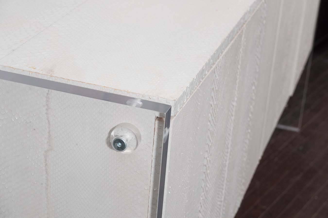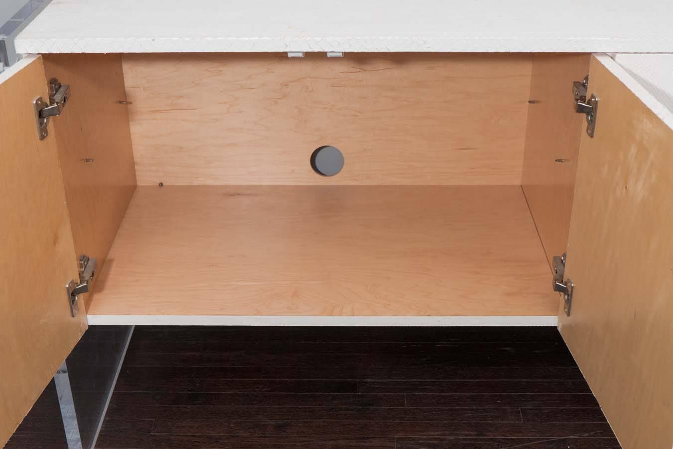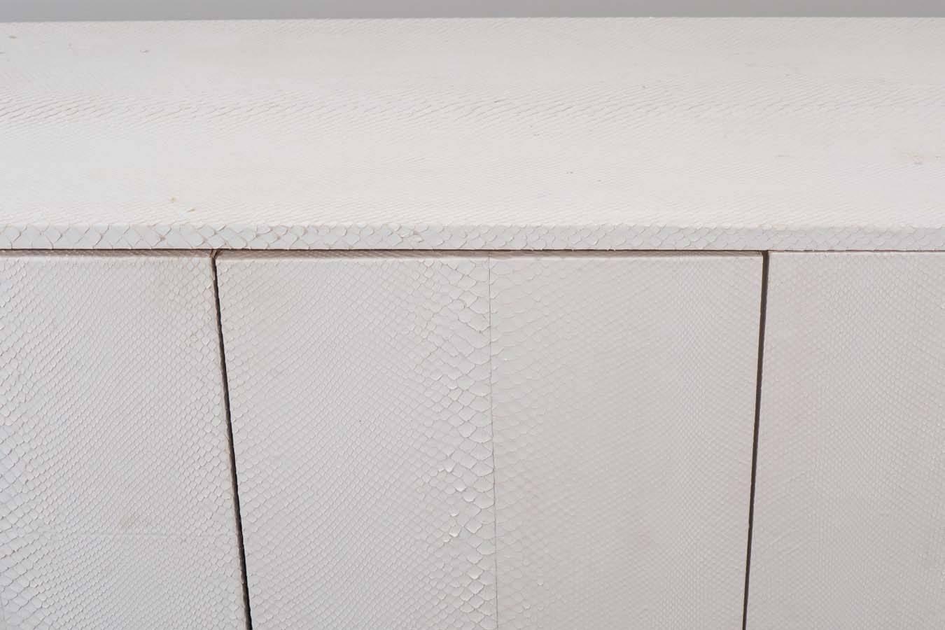 Custom white python sideboard with Lucite side panels. Elevated and modern, this striking sideboard combines python-embossed white leather with sleek Lucite side panels for a clean, floating silhouette. The textured front adds subtle luxury, while the transparent panels keep the piece light and contemporary. Behind its seamless doors, ample storage makes it as functional as it is stylish. A refined statement piece for dining rooms, living spaces, or sophisticated entryways. Currently out of stock but available for custom order in different sizes.
