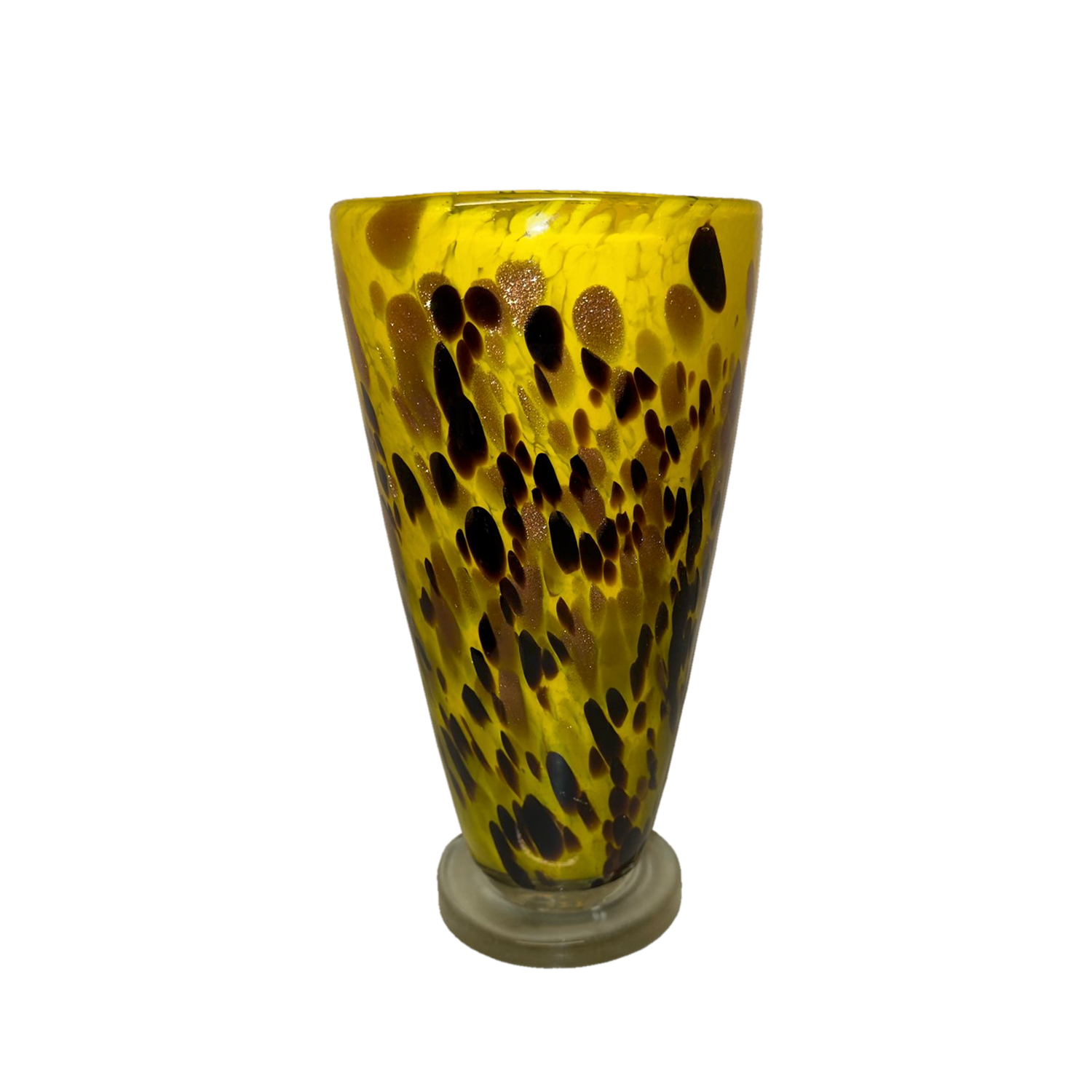 Vibrant and expressive, this hand-blown Murano glass vase is a bold celebration of Venetian artistry and contemporary color. Featuring a luminous yellow base flecked with irregular black and amber speckles, the piece showcases the spontaneous, painterly quality that defines the finest Murano craftsmanship. Each vase is individually formed by master glassblowers on the island of Murano, making every piece a unique work of art. The smooth, tapered silhouette provides a modern canvas for the dynamic speckled pattern—striking from every angle. The amber and black inclusions dance across the surface, creating rich visual contrast and Perfect as a statement centerpiece or as part of a curated glass collection, this vase brings energy, warmth, and artisanal charm to any interior. Murano, Italy Currently available in our NYC showroom. There is also an additional matching vase available.